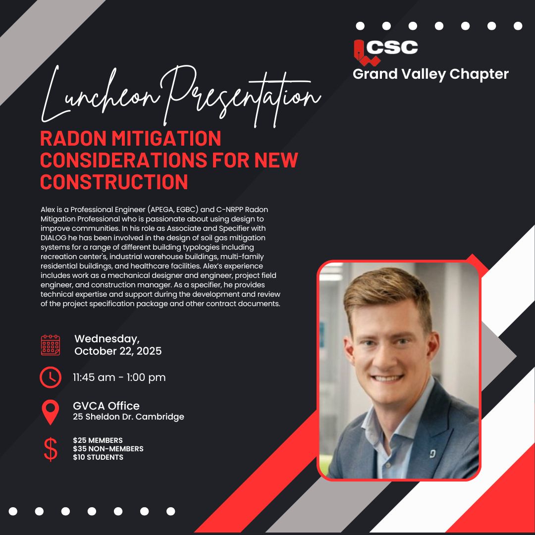 Presented by Alex Graham. Alex is a Professional Engineer (APEGA, EGBC) and C-NRPP Radon Mitigation Professional who is passionate about using design to improve communities. In his role as Associate and Specifier with DIALOG he has been involved in the design of soil gas mitigation systems for a range of different building typologies including recreation center’s, industrial warehouse buildings, multi-family residential buildings, and healthcare facilities. Alex’s experience includes work as a mechanical designer and engineer, project field engineer, and construction manager. As a specifier, he provides technical expertise and support during the development and review of the project specification package and other contract documents.